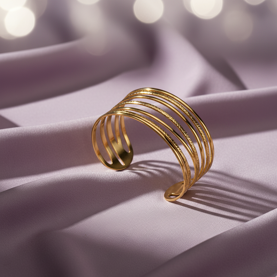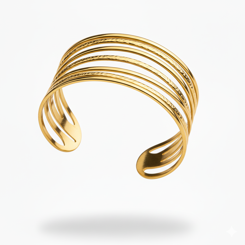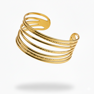Expertly crafted, the Golden Olympia bracelet features a wide design with multiple interlocking rings. The result is a stunning and sophisticated accessory that elevates any outfit. Made from high-quality materials, this bracelet is a must-have for any fashion-forward individual.