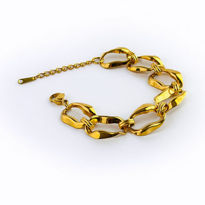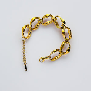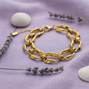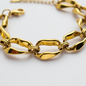 The Marina bracelet features irregular chain links, inspired by the beauty of the sea. This unique design adds a touch of elegance to any outfit. Handcrafted with care, the Marina bracelet is the perfect accessory for any ocean lover.