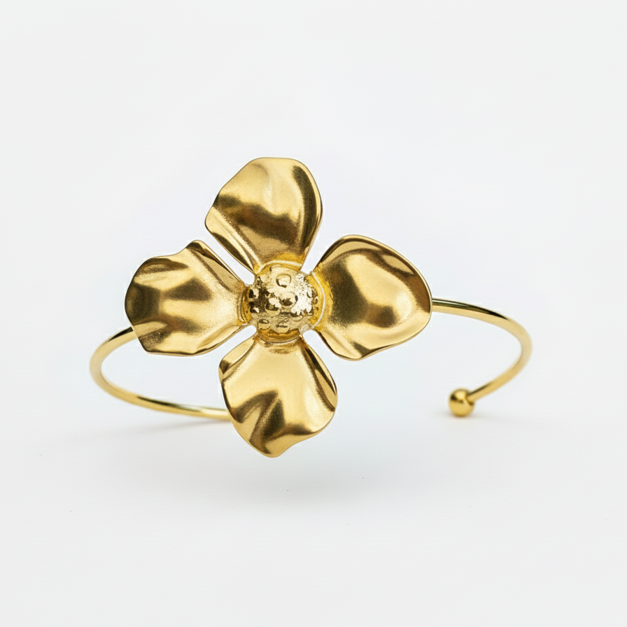 The Petunia Bangle features a stainless-steel, center with a beautiful flower design. With its durable construction, this bangle adds a touch of elegance to any outfit. Perfect for those who appreciate both style and quality.