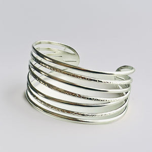 Expertly crafted, the Silver Olympia bracelet features a wide design with multiple interlocking rings. The result is a stunning and sophisticated accessory that elevates any outfit. Made from high-quality materials, this bracelet is a must-have for any fashion-forward individual.