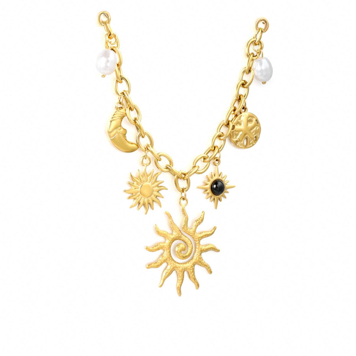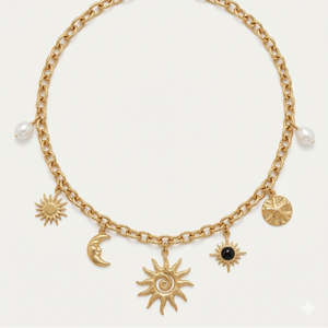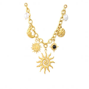 Elegant chain necklace featuring seven dangling charms that capture celestial and natural magic. Each piece tells a story: radiant sun, serene moon, and luminous pearls intertwined in perfect harmony. Versatile design that combines symbolism with sophistication, ideal for those seeking meaningful accessories. The charms move freely, creating movement and sparkle with every step. Perfect for everyday wear or special occasions.
