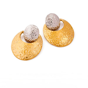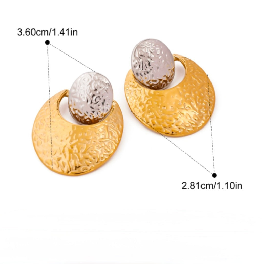 The Eclipse earrings feature a striking design that expertly blends gold and silver tones. Their large size and eye-catching finish make them a perfect statement piece for anyone seeking to elevate their style with a modern and sophisticated touch. Ideal for enhancing any outfit and drawing attention effortlessly.