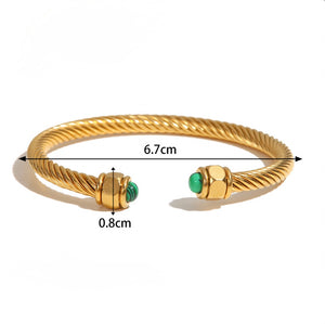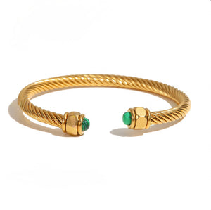 Twisted bangle bracelet featuring natural stones positioned at each end for striking visual impact. The distinctive spiral design creates a contemporary silhouette that commands attention while maintaining refined elegance. Gemstone accents deliver a luxurious touch, elevating any ensemble from casual to formal occasions. This versatile piece showcases sophisticated craftsmanship and serves as a statement accessory for those who appreciate distinctive jewelry with understated glamour.