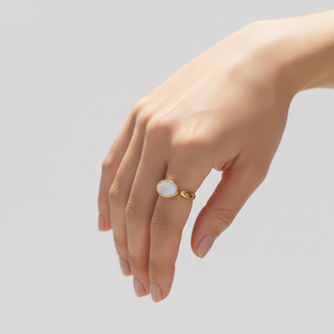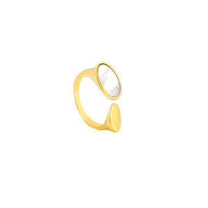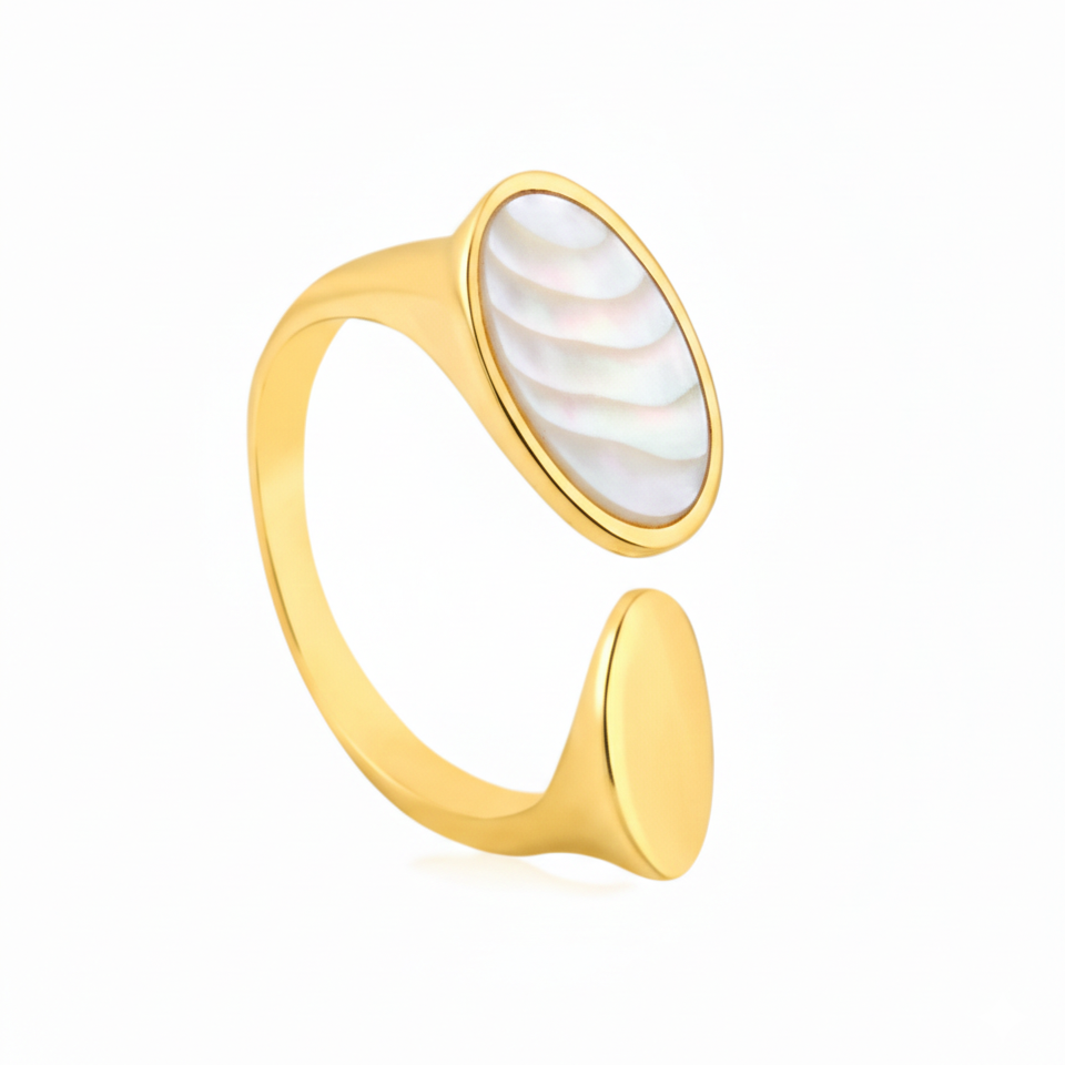 Golden ring featuring an elegant oval mother-of-pearl centerpiece. This timeless design combines warm metallic tones with the lustrous, iridescent beauty of natural nacre. Perfect for adding sophisticated charm to any jewelry collection.